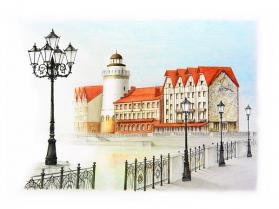 О/131/003 Открытка почтовая для посткроссинга акварель города России Калининград "Рыбная деревня и башня Маяк"